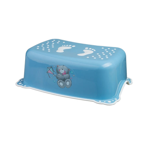 Skammel i blå farve med Bamse motiv og anti-skrid gummi i bunden og på overfladen.