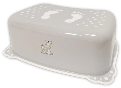 Skammel i grå farve med med Zebra motiver. og anti-skrid gummi i bunden og på overfladen.