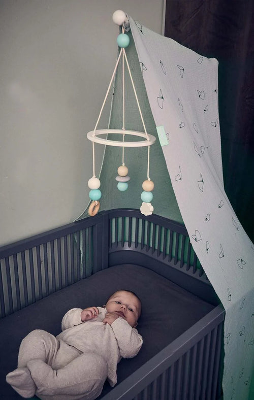 Himlen er lavet til Himmelpinden fra Najell og skaber tryghed over tremmesengen eller kravlegården.