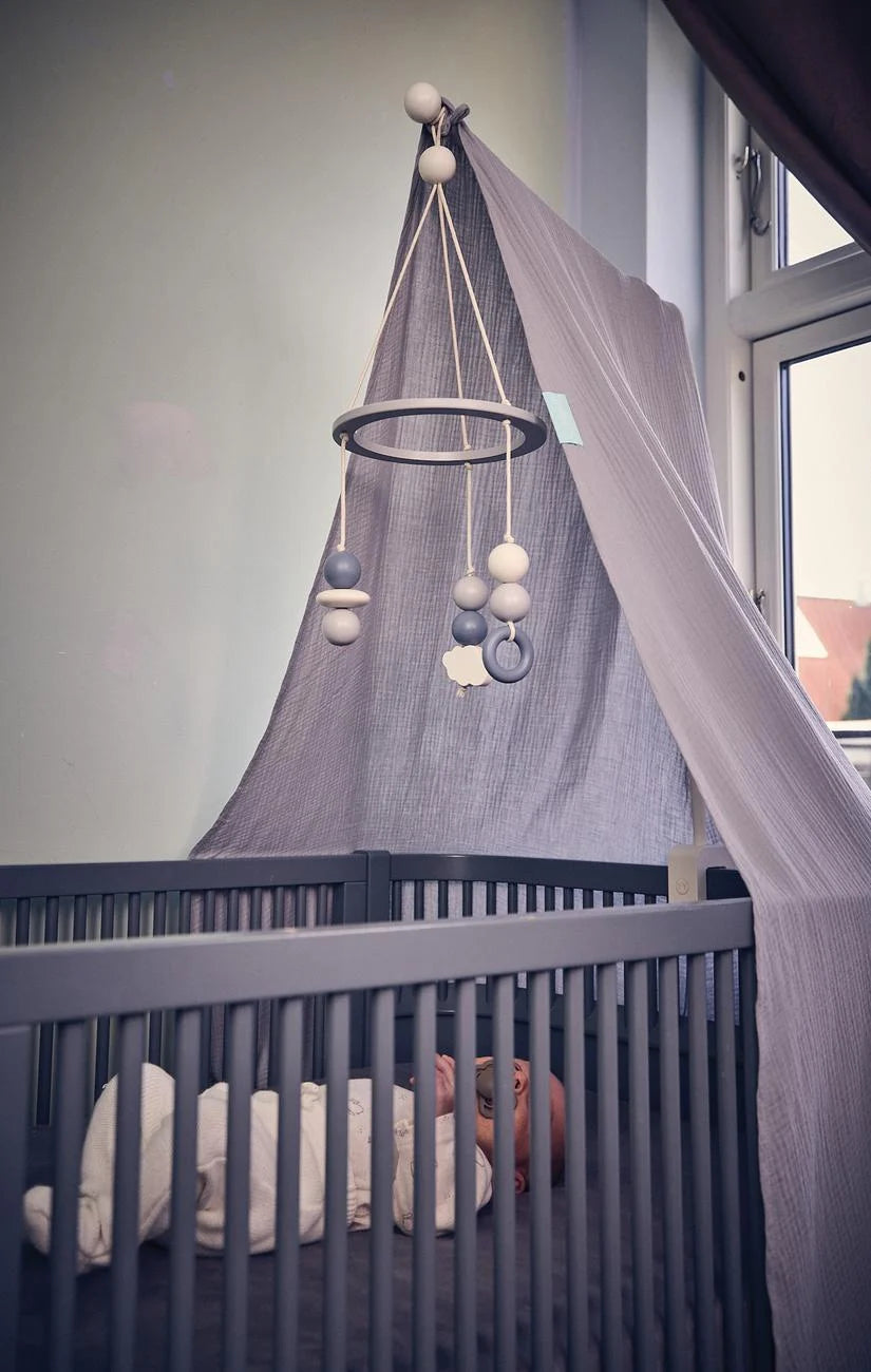 Himlen er lavet til Himmelpinden fra Najell og skaber tryghed over tremmesengen eller kravlegården.