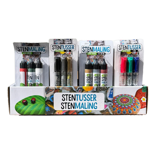 Stenmalingen kan bruges på alle typer sten, og males direkte på stenen fra tuben. Du kan lave dine helt egne stendyr, kunst på sten, bordkort eller noget helt andet. At male sten er timevis af sjov for både store og små børn. HUSK at stenene skal være tørre og rene inden påføring, for optimal vedhæftning.