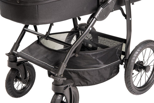Stellet har drejelige forhjul, så vognen er let at køre med. Disse kan låses, hvis I skal ud og køre i ujævnt terræn.
