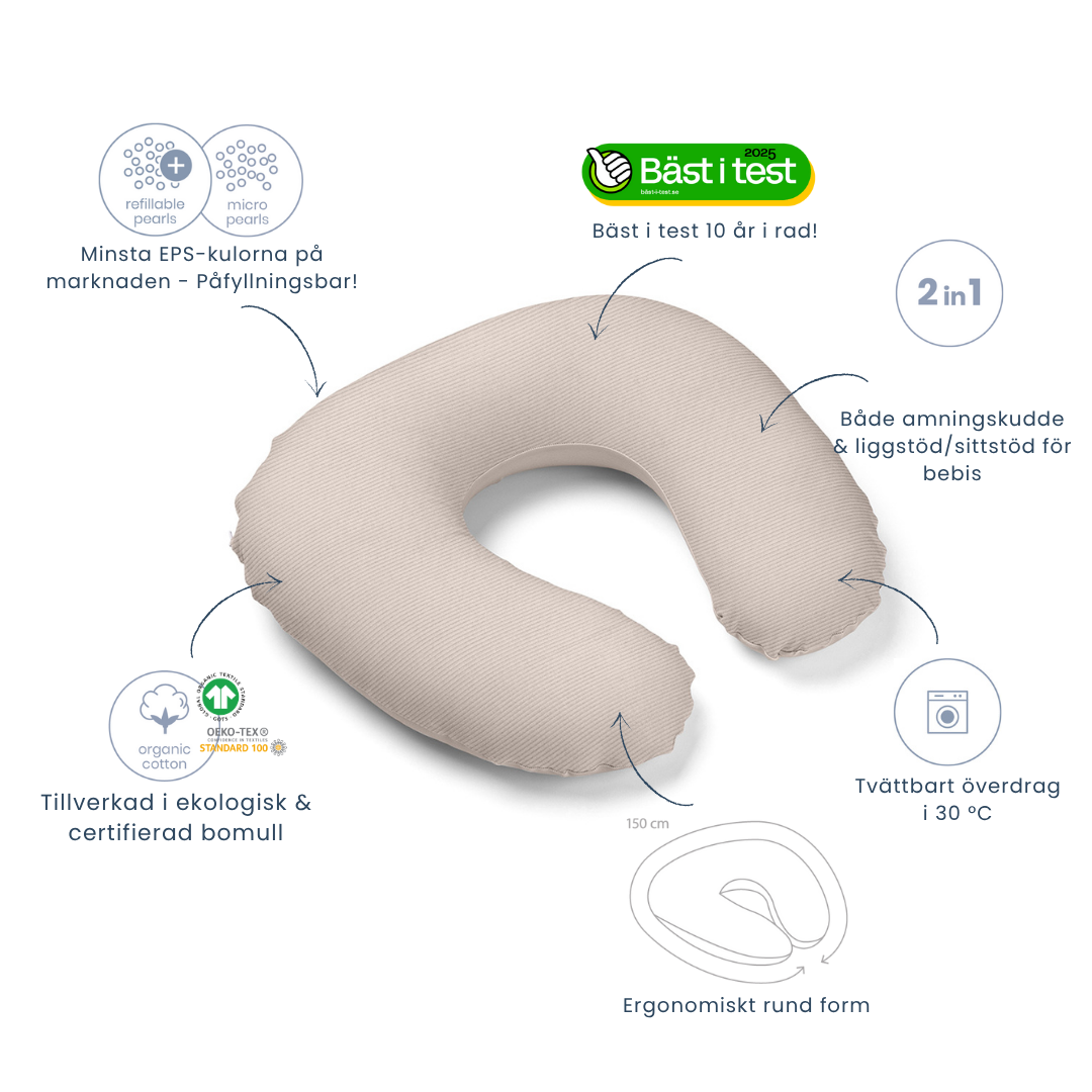 - Multifunktionel: Kan bruges både som ammepude og som støttepude til barnet, når det lærer at sidde op eller ligge på maven.