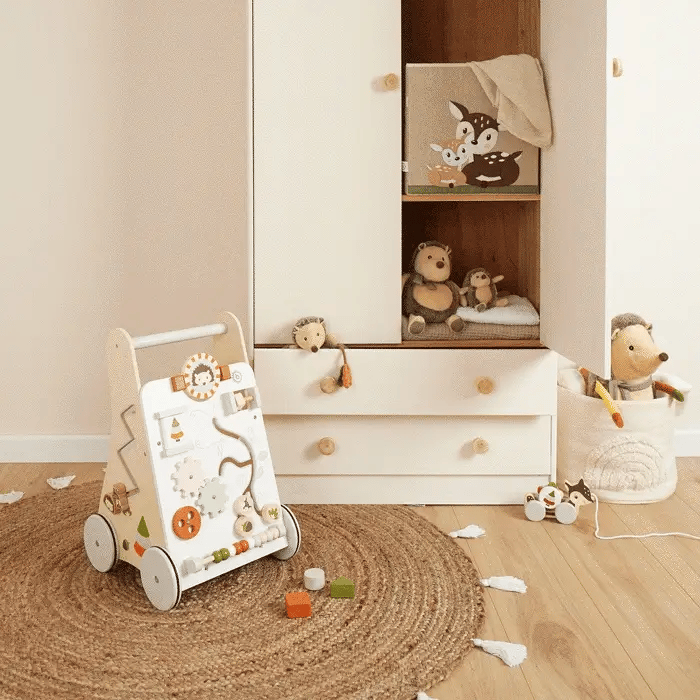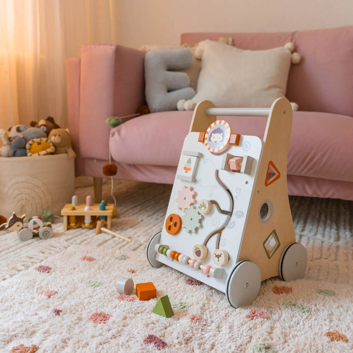 Gåvognen er dekoreret med skovens dyr og udover at være perfekt til at øve gang har vognen også 8 forskellige muligheder for leg, der styrker dit barns læring og engagement.