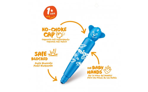 Formen på tusserne er sjove og lavet til babyhænder, så det er nemt at holde på tussen. Proppen er formet som et "bamsehoved" og er kvælningsfri, der er små huller i.