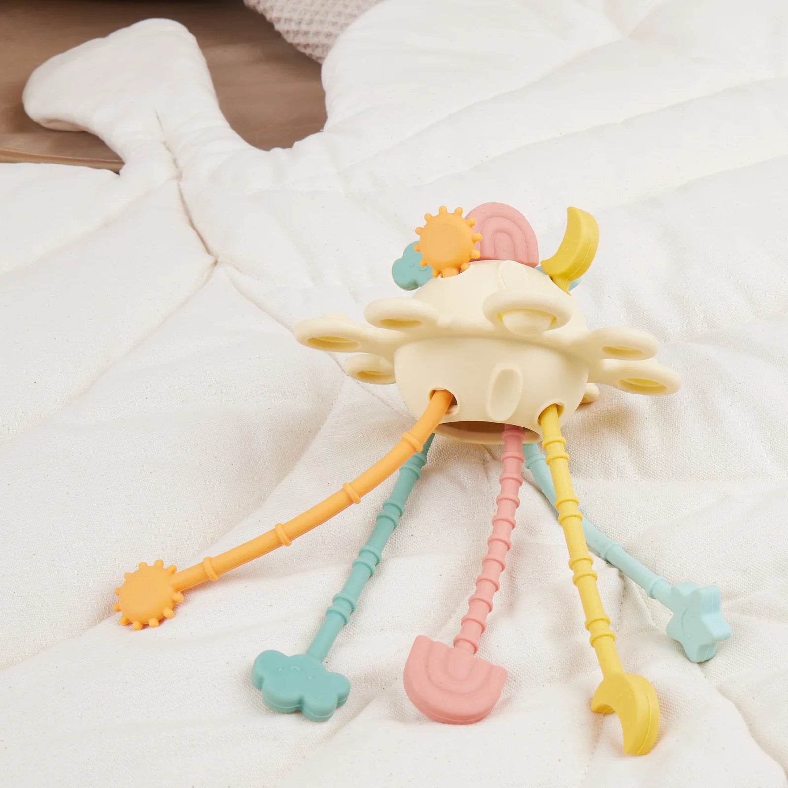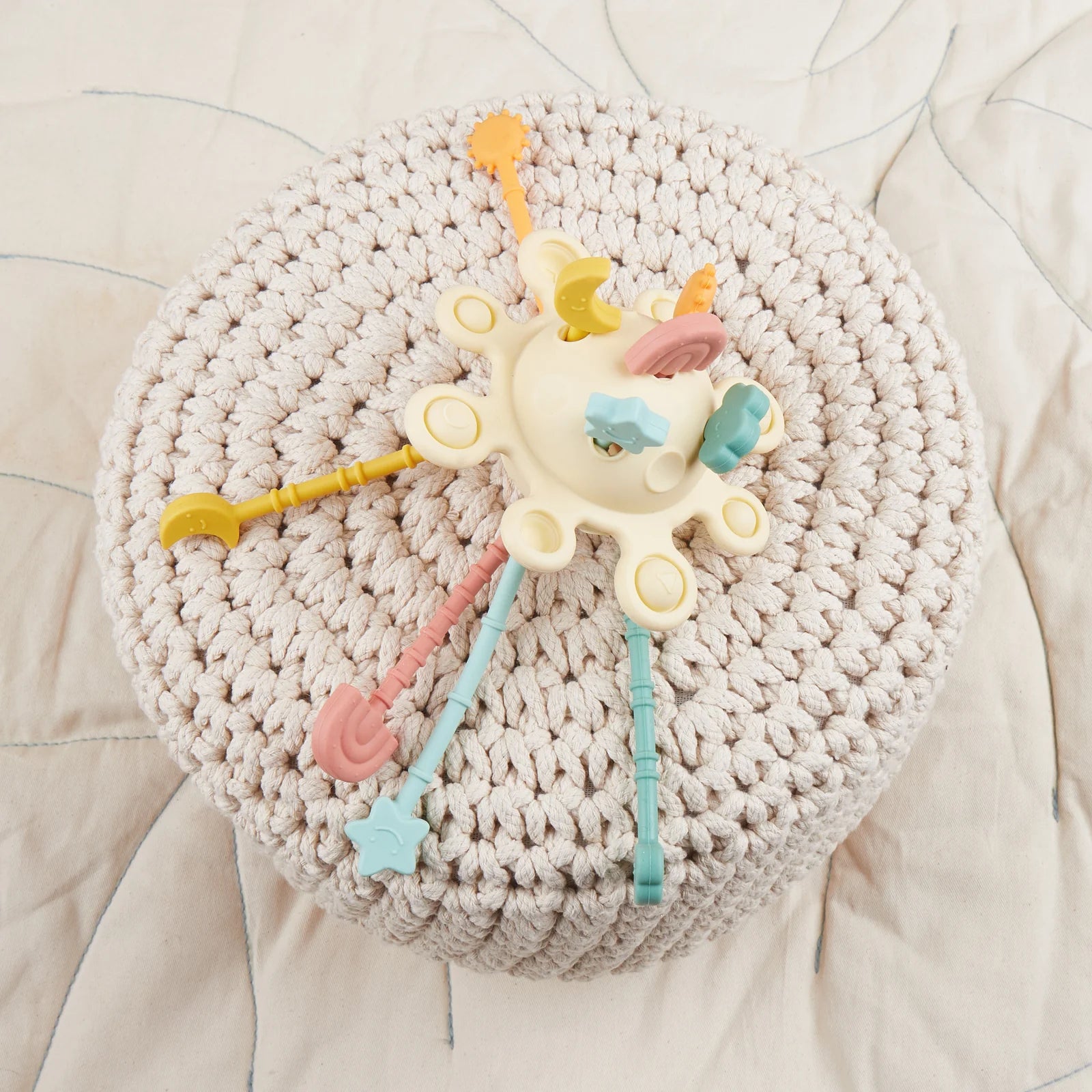 Den indeholder silikone træksnore udformet som sol, måne og stjerner, der er gemt inde i planeten. Derudover kan dit barn trykke på knapper og udforske de forskellige teksturer, der også kan klemmes.