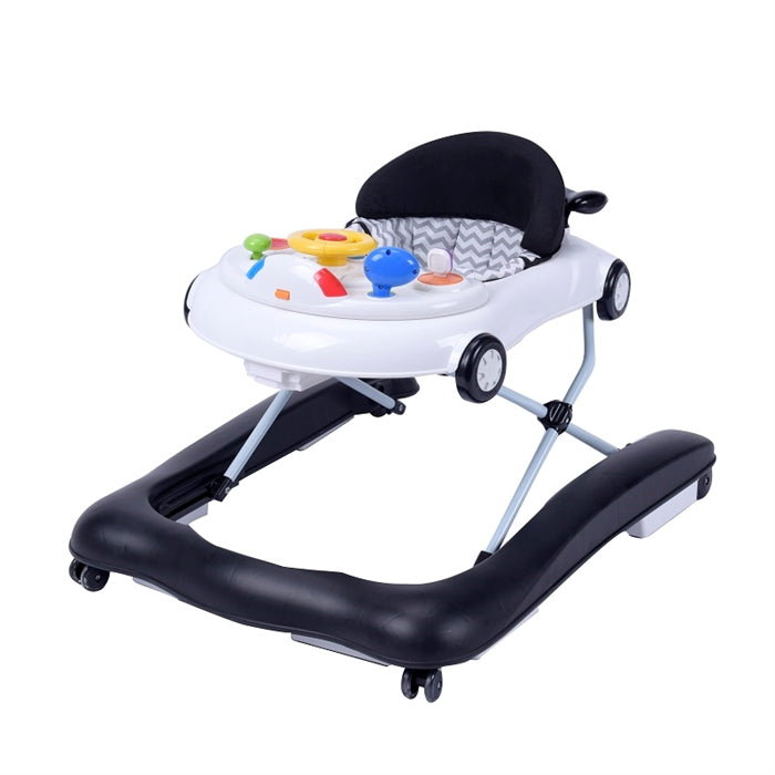 Gåstol i sort/grå med panel formet som en bil. Gåstolen er udstyret med polstret sæde og legepanel der indeholder musik, lys og lyde.