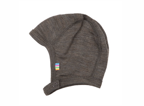 Hue i lækker kvalitet. Den er dejlig blød i en let uldkvalitet med god pasform. Blød, elastisk, let uldkvalitet. Huen lukkes under hagen med en trykknap. Her er to længder, så huen kan tilpasses det enkelte barn. Ensfarvet meleret farve.