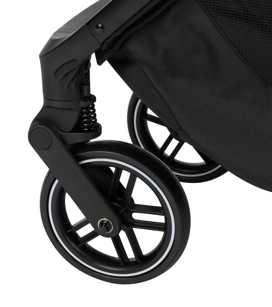 Hjulene er EVA som er et slidstærkt materiale og kan holde til mange lange gåture. De er punkterfrie.