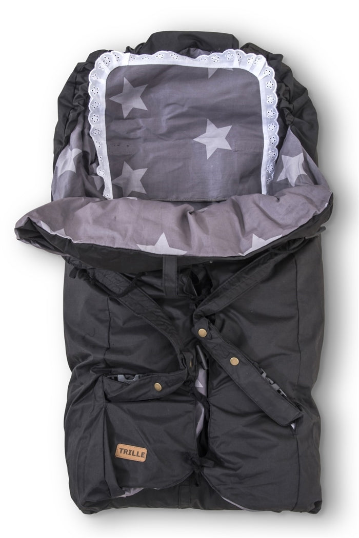 Trilleposen kan også bruges som en kørepose og der er markeringer hvor en barnevognssele kan komme igennem.