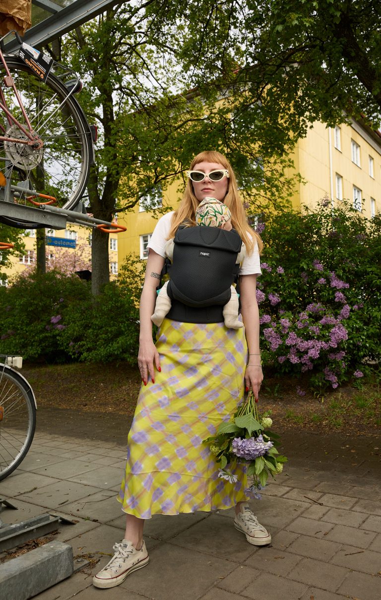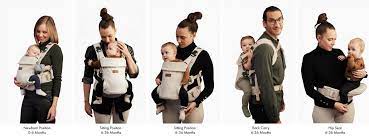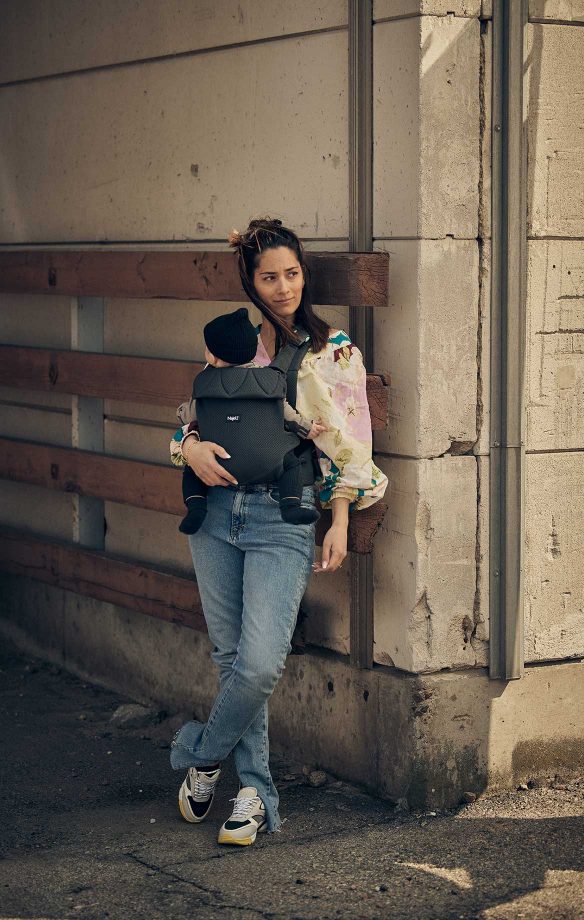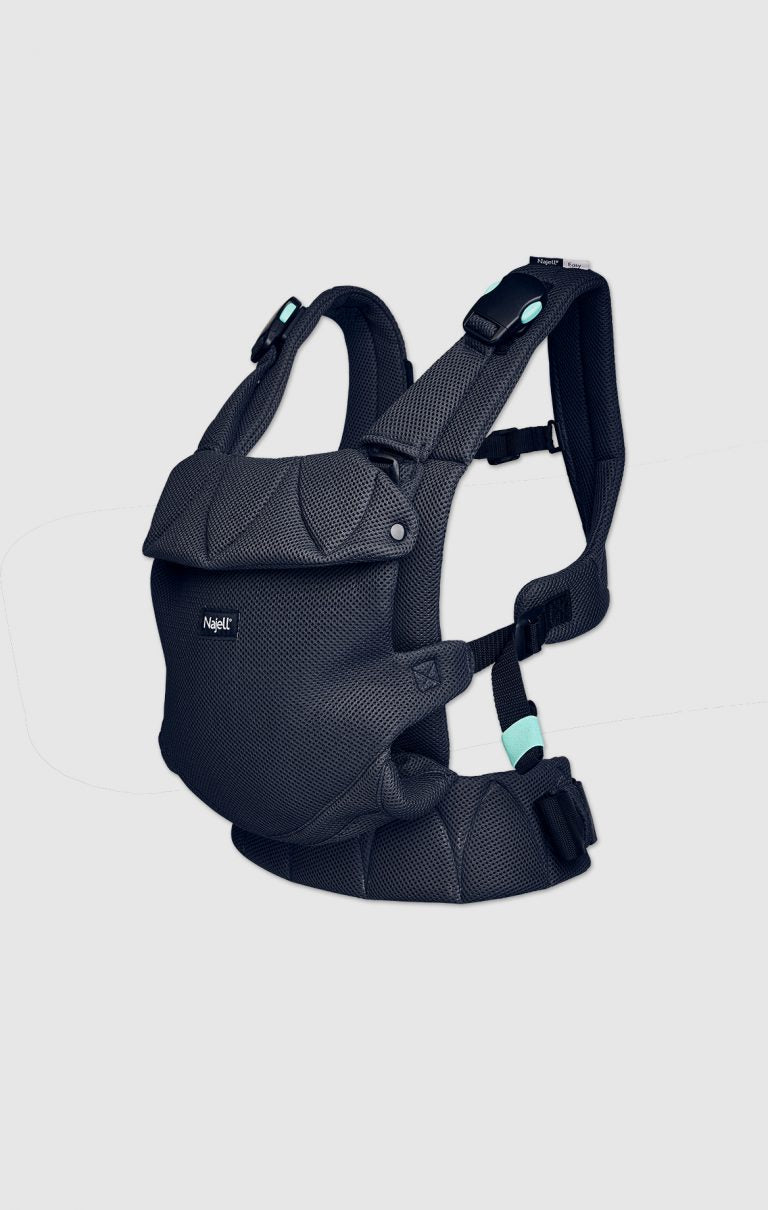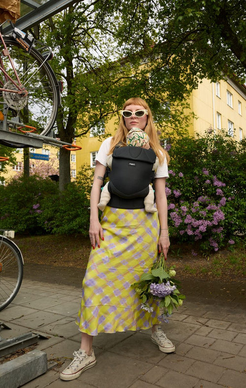 En lille ny skal vende med ansigtet ind mod maven på dig og ca ved 5-6 mdr så er barnet klar til at vendre fremad og kigge på den store verden.