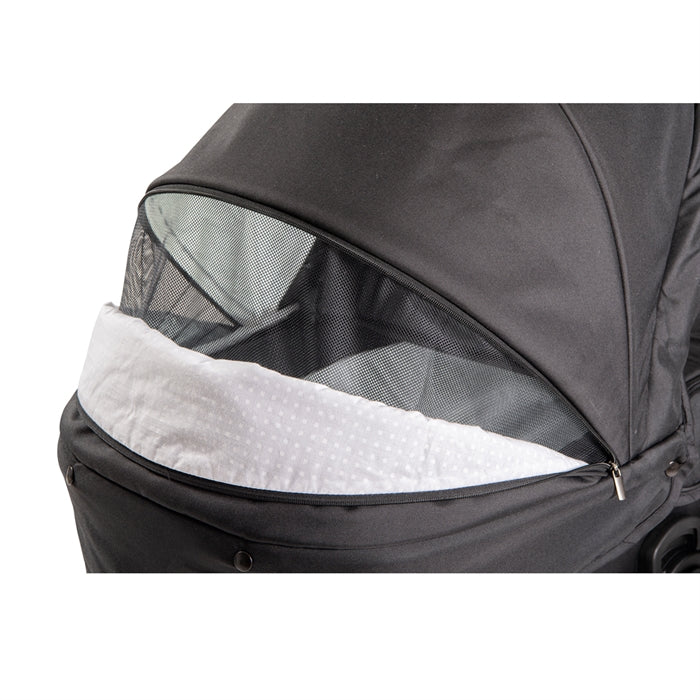 Der er lynlås i dækkenet så det er let at tage barnet op efter en lille lur i vognen.